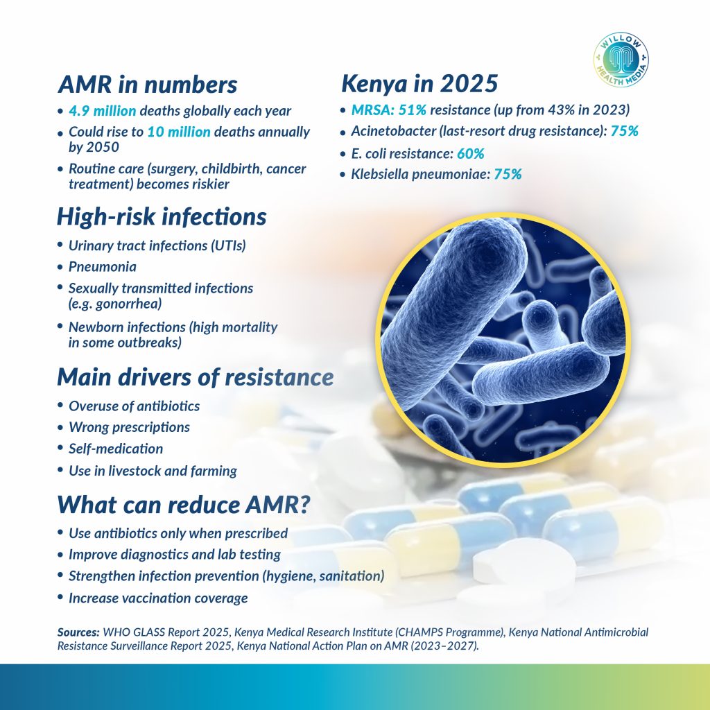 In Kenya, numbers from the national surveillance data from 2025 are worrying. Take MRSA, a dangerous bacterium that causes wound infections. In 2023, 43 out of 100 people with this infection could not be treated with standard antibiotics. By 2025, that number jumped to 51 out of 100.