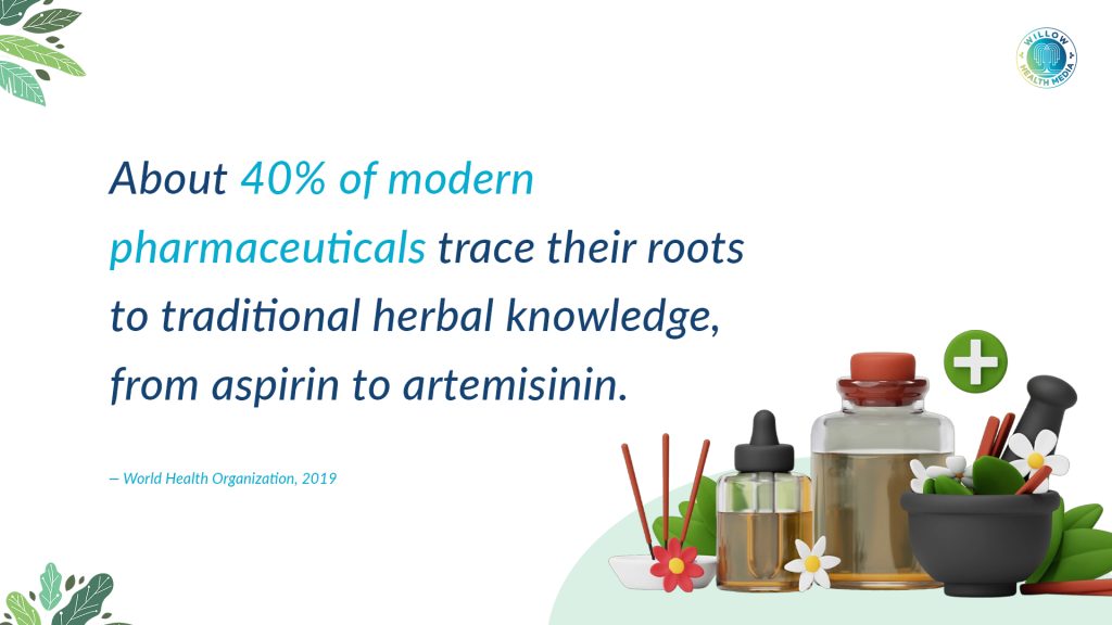 - About 40% of modern pharmaceuticals trace their roots to traditional herbal knowledge (including aspirin and artemisinin)