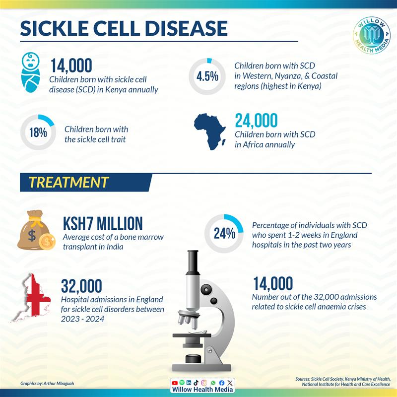 According to the Ministry of Health, at least 14,000 children are born with sickle cell disease in Kenya annually and about 18 per cent carry the sickle cell trait, with the highest burden in Western, Nyanza, and Coastal regions.