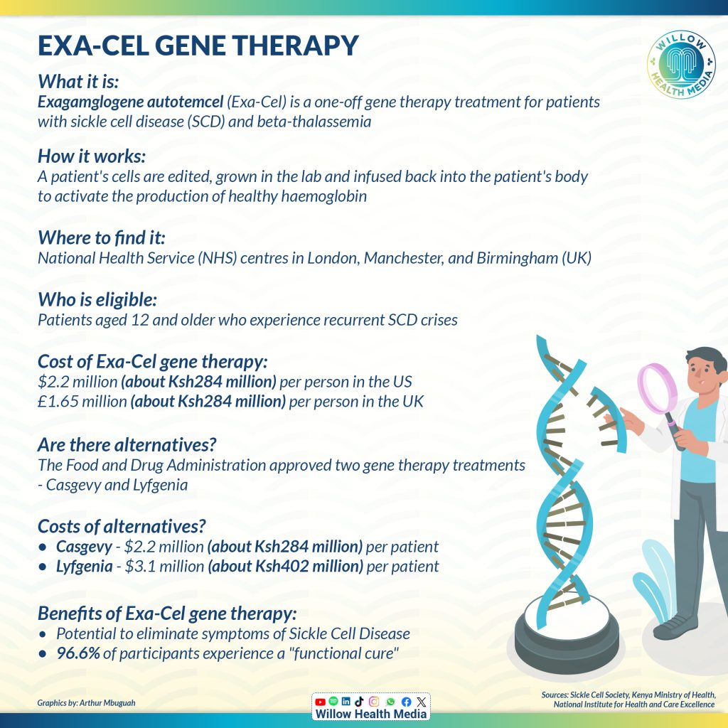 Exa-cel gene therapy, Casgevy and Lyfgenia also have prohibitive costs of $2.2 million (Ksh285 million) and $3.1 million (Ksh402 million) per patient, respectively.
