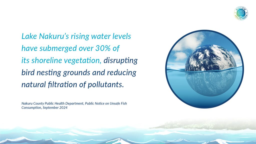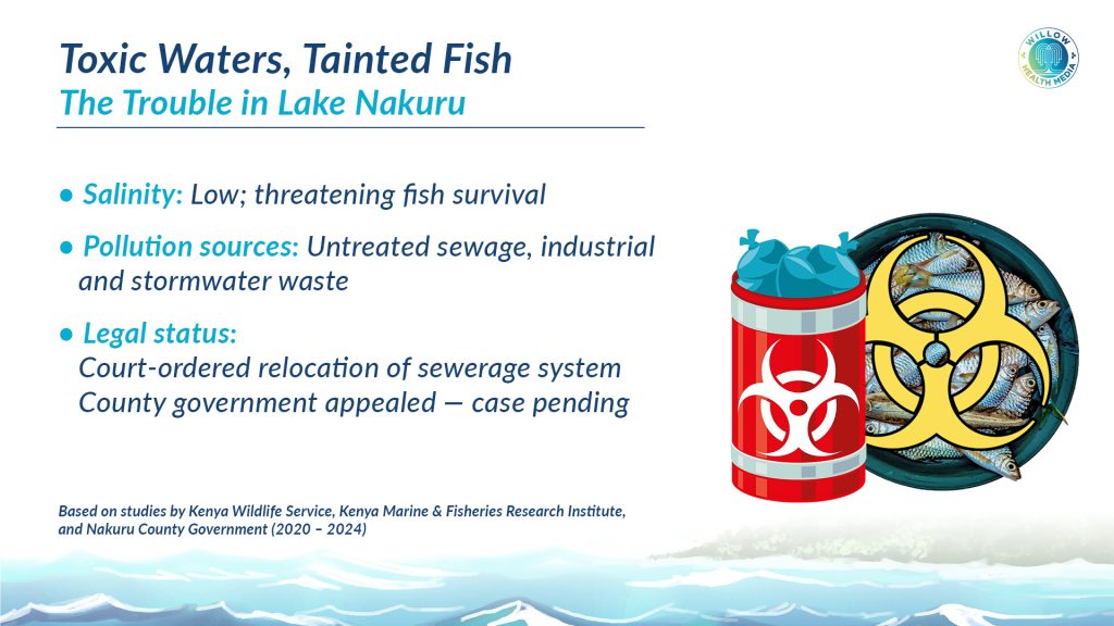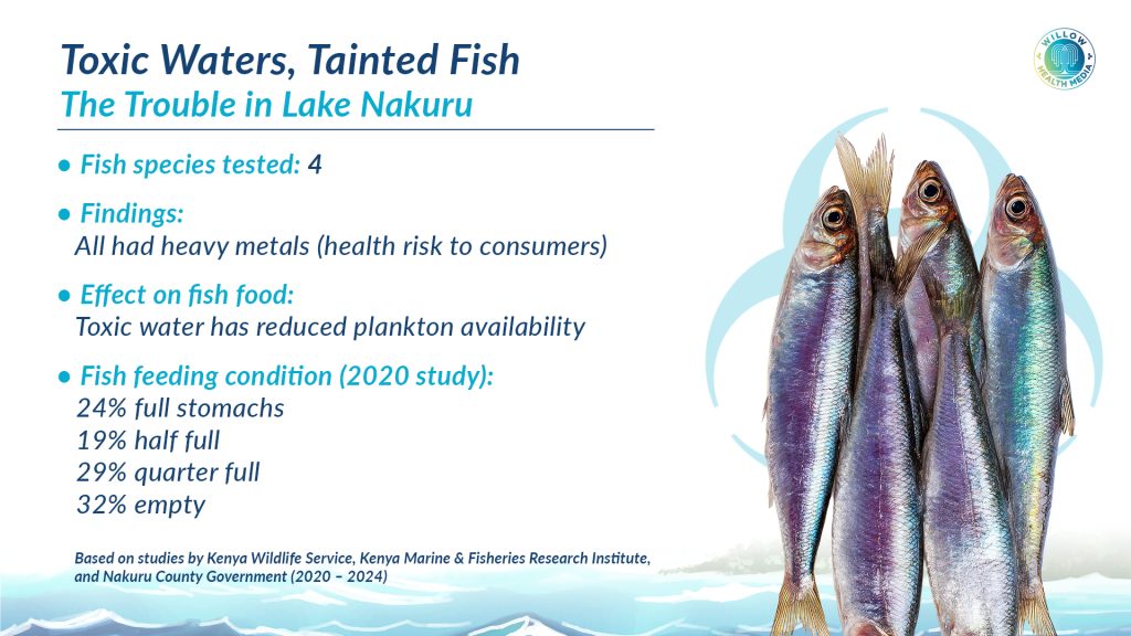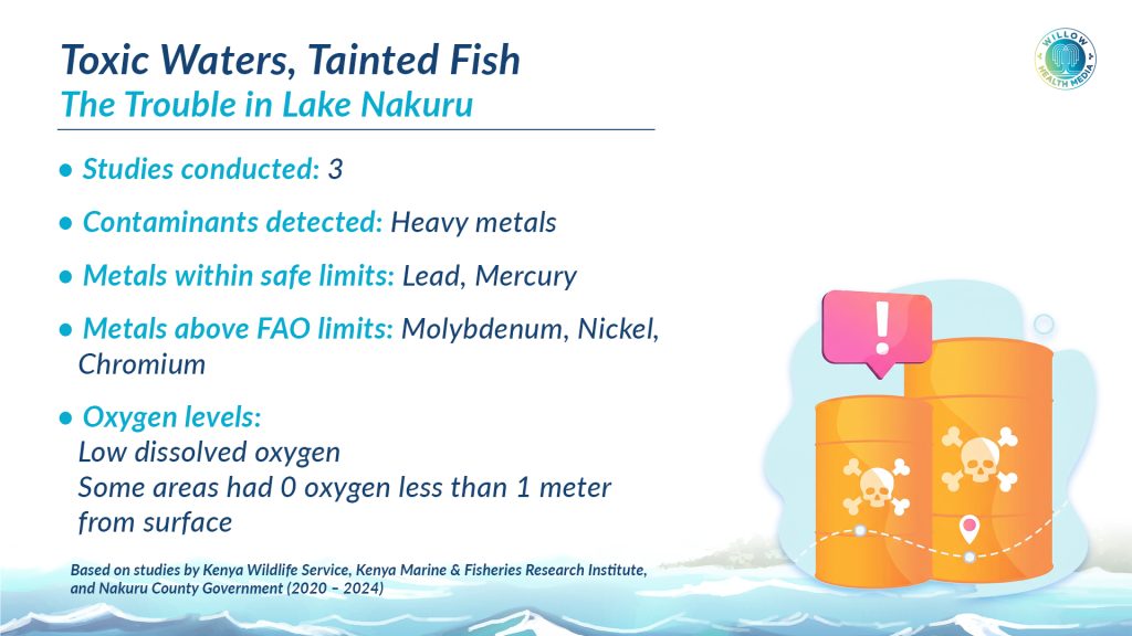 Research conducted by experts from KWS, Nakuru County government and the Kenya Marine Fisheries Institute (KMFI) found that at least four out of eight fish sampled contained chromium and nickel metals exceeding Food and Agriculture Organisation (FAO) standards. Lead was detected in all sampled fish, though at recommended levels.