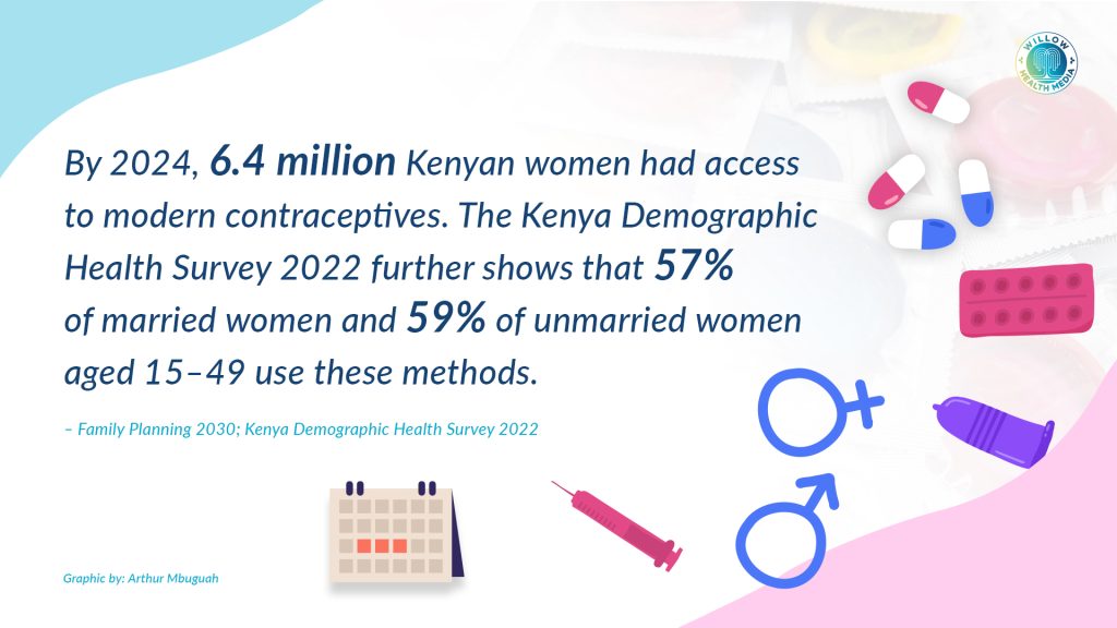 Data from the Family Planning 2030 website reveal that 6.4 million Kenyan women had access to modern contraceptive methods by 2024. According to the Kenya Demographic Health Survey 2022 found that 57% of married women and 59% of unmarried women, aged 15-49, use modern contraceptive methods. These methods include: Intrauterine devices (IUDs), male and female condoms, emergency contraception, birth control pills, implants and lactational amenorrhea (using breastfeeding as a temporary method).
