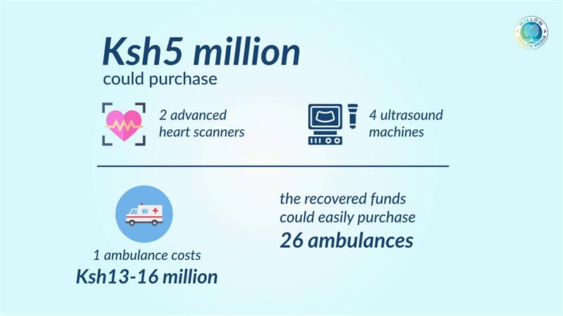 With just Ksh5 million from looted funds, the county could have purchased two advanced heart scanners and four ultrasound machines. One ambulance costs between Ksh13-16 million, meaning the recovered funds could purchase 26 ambulances, critical for a county where mothers sometimes give birth by the roadside during transit to hospitals.