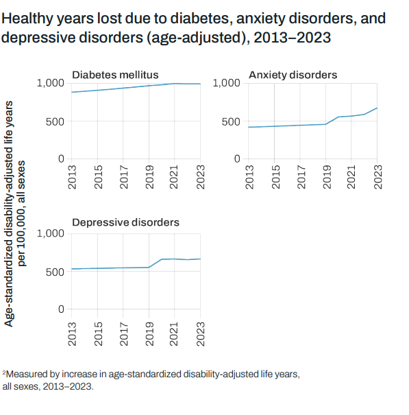 “The burden of diabetes alone has grown by more than 25 per cent in the past decade,” she noted, alongside rising depressive and anxiety disorders.
