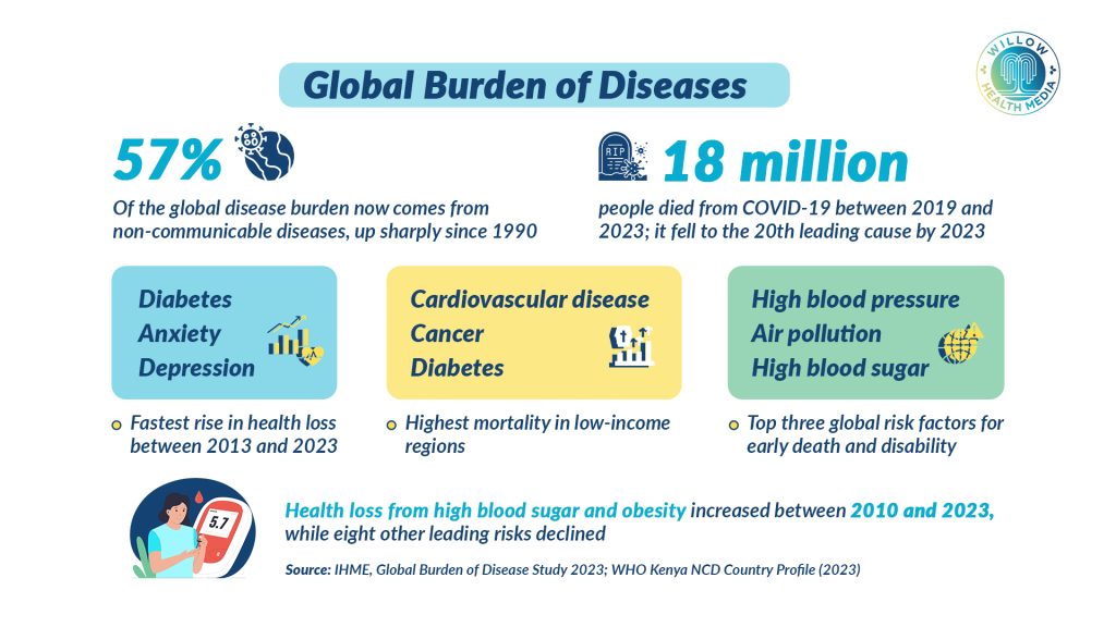 Kenya reflects these shifts. Life expectancy has risen to 67 years, yet inequality persists between counties. According to IHME’s 2023 country profile and the Kenya STEPwise NCD survey, NCDs now cause 55 per cent of all deaths.