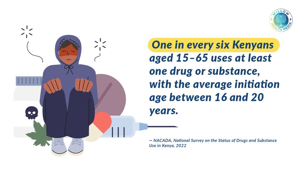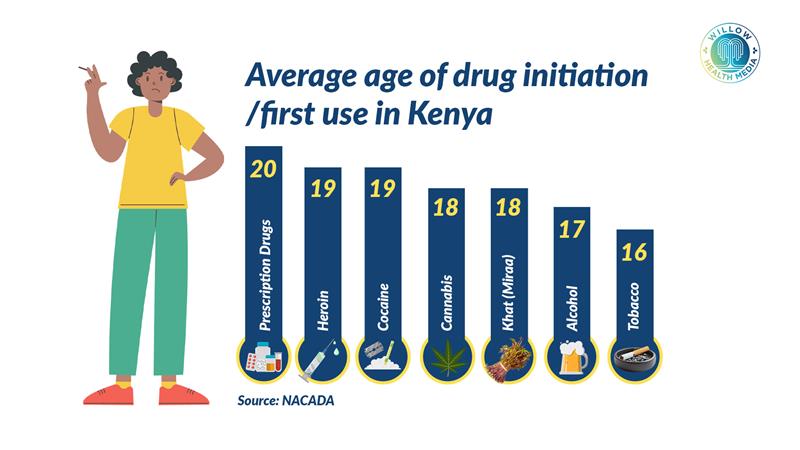 The average initiation age for tobacco, alcohol, khat (miraa), cannabis, cocaine, heroin and prescription drug use in Kenya is between 16-20 years