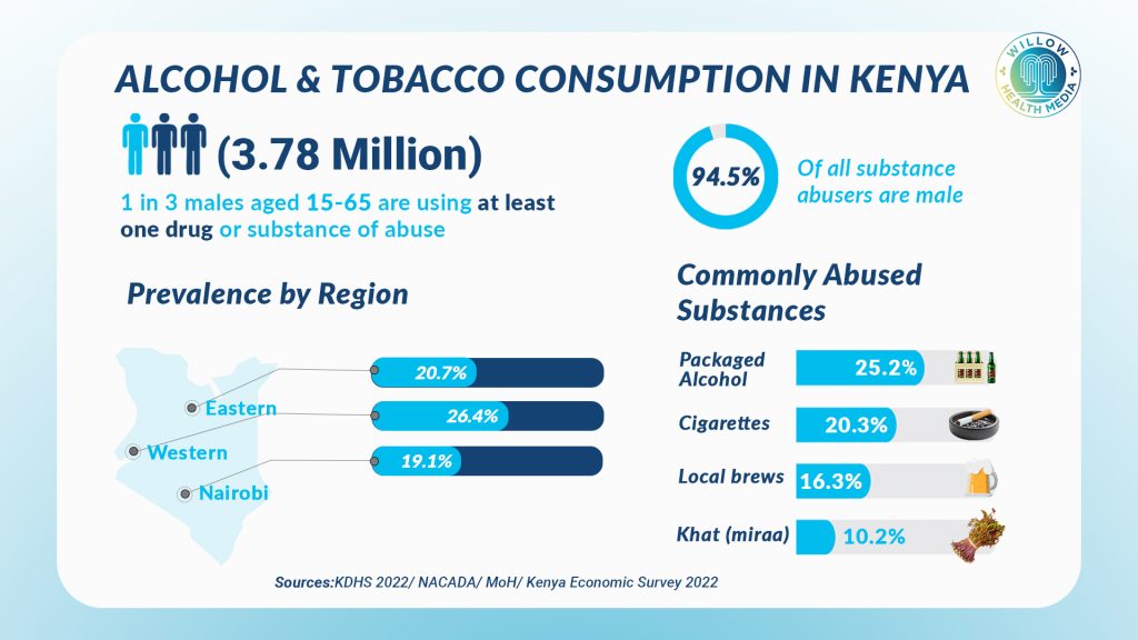 It also established that one in every 8 Kenyans aged 15-65 years was using alcohol. Overall, western Kenya had the highest prevalence of alcohol (23.8 per cent), followed by Coast (13.9 per cent) and Central Kenya (12.8 per cent).