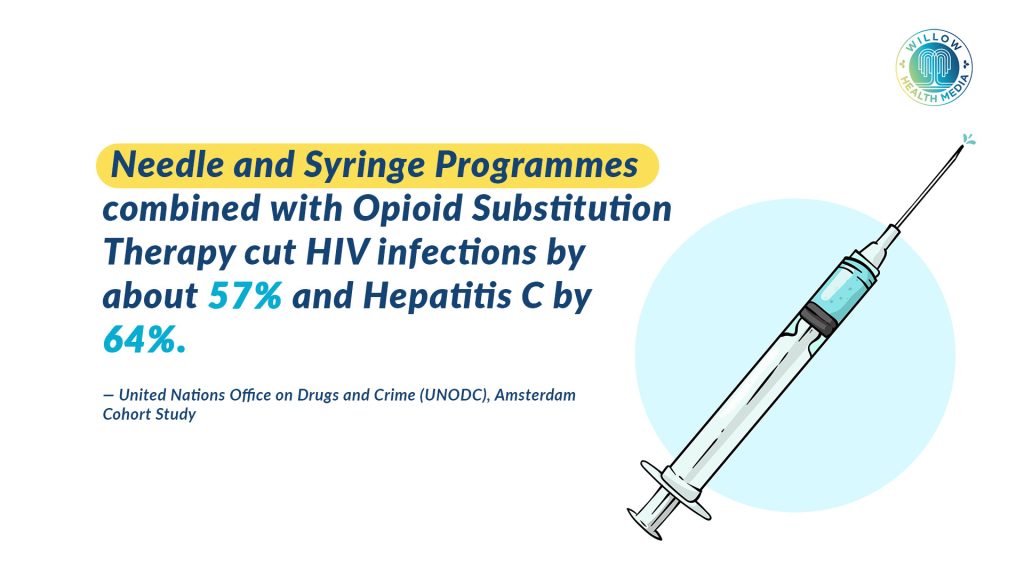 According to the United Nations Office on Drugs and Crime, empirical evidence from an Amsterdam cohort showed that Needle and Syringe Programmes plus Opioid Substitution Therapy reduced HIV incidence by 57 per cent and Hepatitis C incidence by 64 per cent.