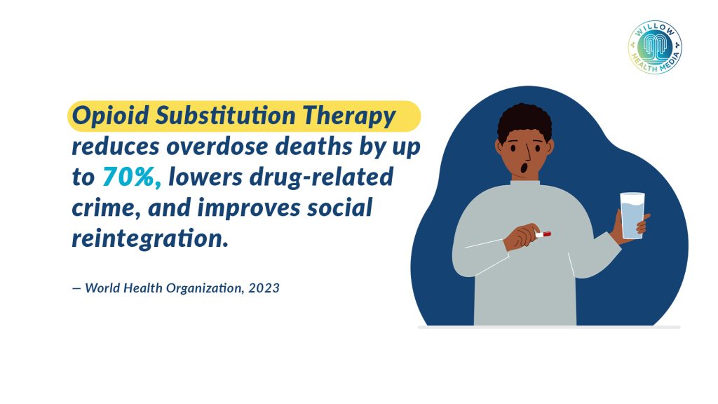 Like NSP, Opioid Substitution Therapy helps to stabilise people with opioid dependence by replacing illicit opioids like heroin. with a medically supervised, longer-acting opioid such as methadone or buprenorphine. The replacement opioid is taken under medical supervision, helping to prevent withdrawal and cravings without the rapid highs and lows of street opioids.