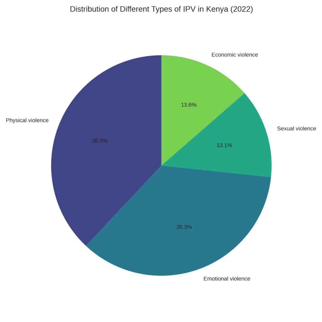 The 2022 Kenya Demographic and Health Survey (KDHS) indicates that the overall prevalence of Intimate Partner Violence (IPV) is around 41 per cent, with partner violence at 30 per cent physical, 28 per cent emotional, 10 per cent sexual, and 11 per cent economic abuse.