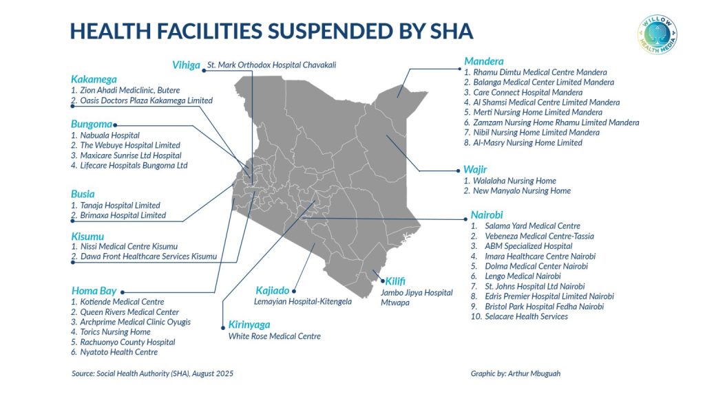 The Social Health Authority recently suspended 40 health facilities across Kenya from accessing public health insurance benefits under the Social Health Insurance Act, 2023, the largest public suspension of health providers since the transition from NHIF began.