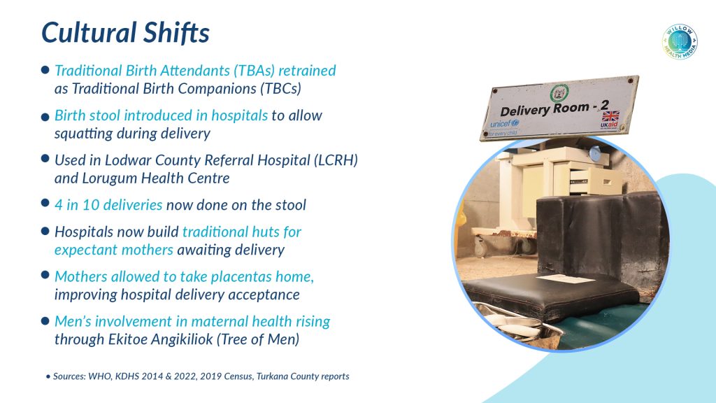 Ekiru Kidaalo, Director of Medical Services in Turkana County, said Kimormor has increased hospital deliveries as “We’ve integrated the culturally accepted birth stool in hospitals to attract mothers who insist on delivering in a squatting position.”