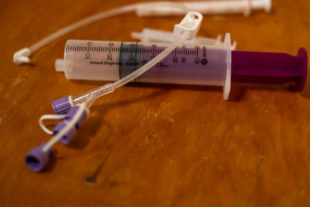 Doctors later replaced the tube with a button-style PEG, which was easier to manage but had to be purchased privately. Lucy recalls searching unsuccessfully for a 150 millilitre syringe at chemists and hospitals, eventually buying one from an agrovet shop.