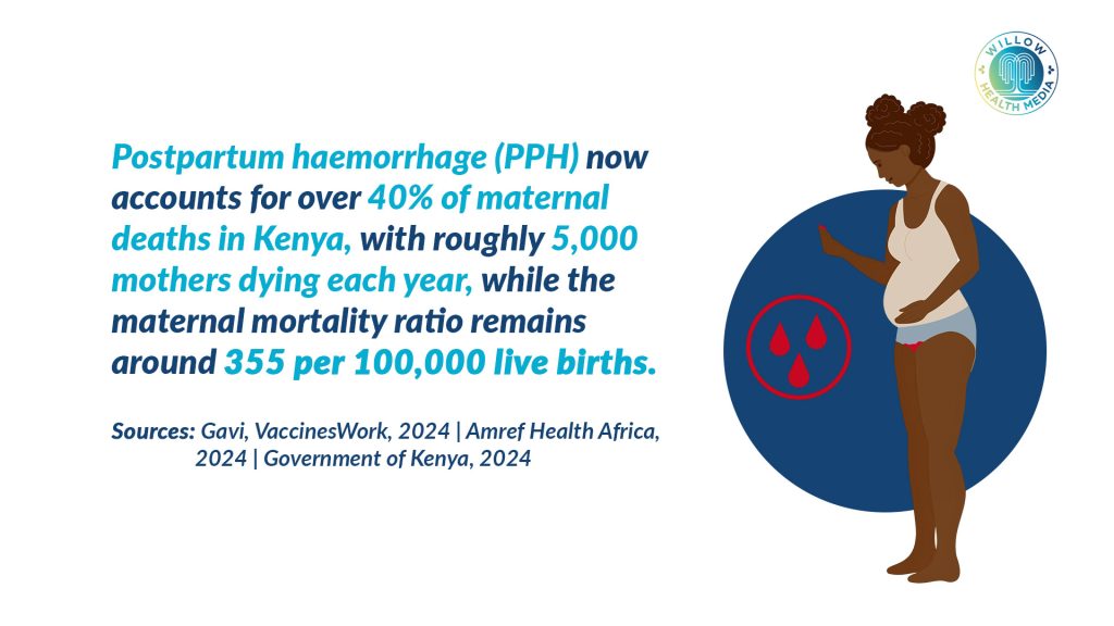 The 2019 Kenya National Census estimated the maternal mortality ratio at 355 deaths per 100,000 live births – about 5,680 annual maternal deaths, with postpartum haemorrhage accounting for 34 per cent of these deaths.