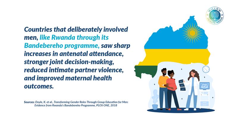 Rwanda’s “Bandebereho” programme (meaning ‘Role Model’) provides group education for expectant fathers. Studies show it significantly increased antenatal care attendance, improved joint decision-making, reduced intimate partner violence, and improved maternal health outcomes.