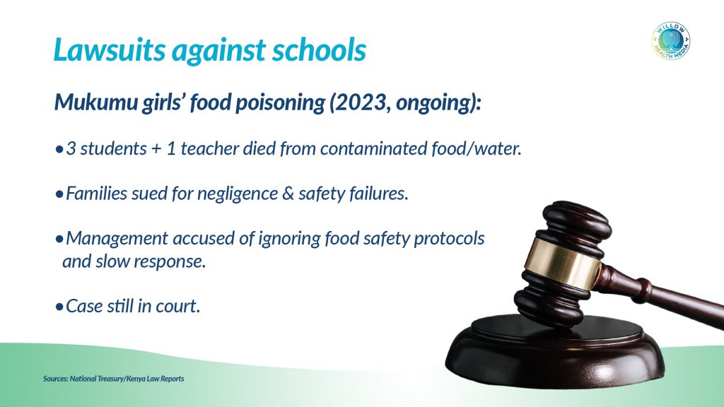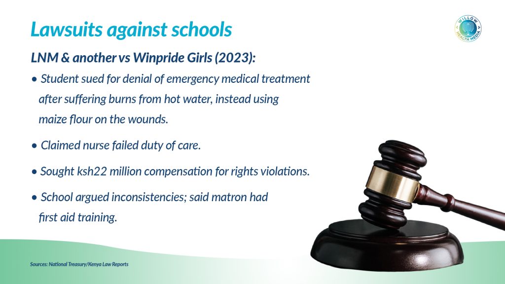 For instance, Gilgil Hills Academy, a private boarding school, was sued in 2009 after a student deteriorated and died under school medical care when a school nurse administered anti-malarial medication without confirming the diagnosis or escalating to qualified personnel. The court found a breach of the duty of care owed by the school and held the institution liable for negligence in healthcare provision.