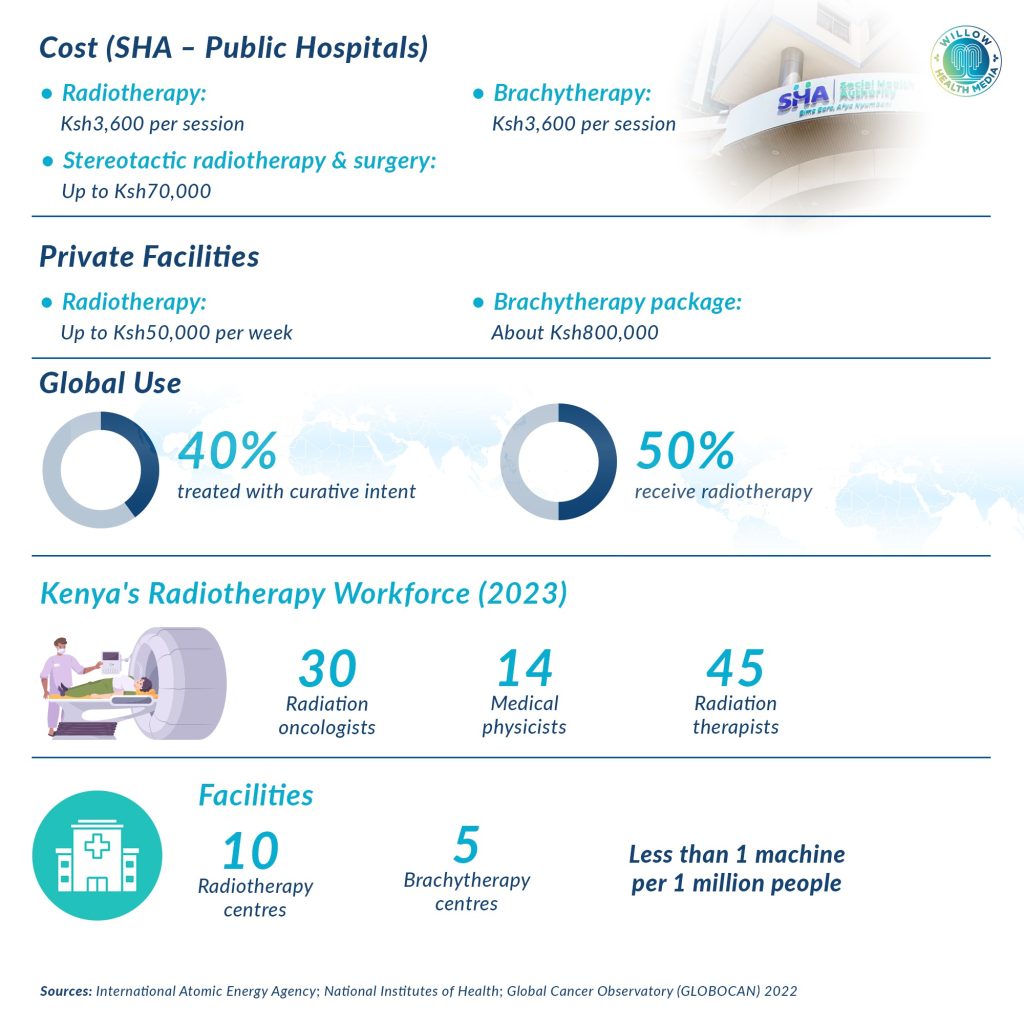 The cost of radiotherapy varies widely between public and private hospitals. Under Kenya’s Social Health Authority (SHA) oncology package, radiotherapy in public facilities is capped at Ksh3,600 per session, brachytherapy at Ksh40,000, and stereotactic radiotherapy and surgery are covered up to Ksh70,000. In private facilities, however, costs can be much higher. Radiotherapy may cost up to Ksh50,000 per week, while a full brachytherapy package can reach Ksh800,000.