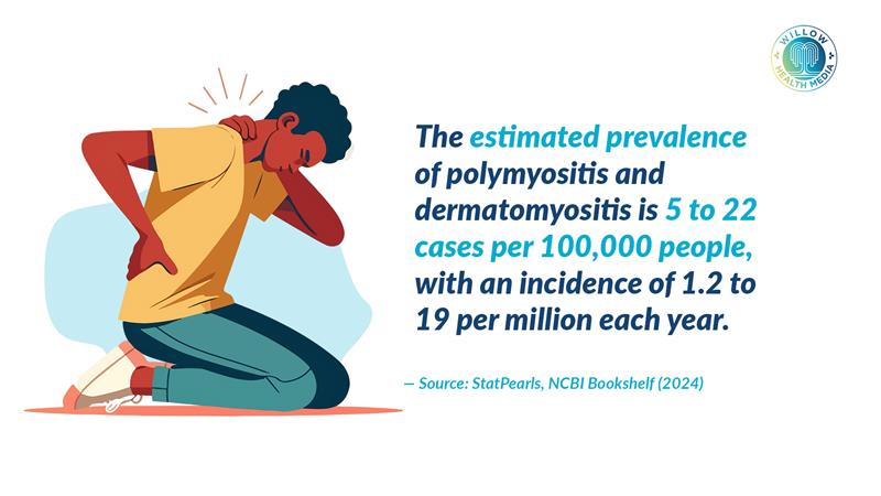 Polymyositis affects between five and 22 people per 100,000 worldwide, according to the National Center for Biotechnology Information (NCBI) data for 2024.