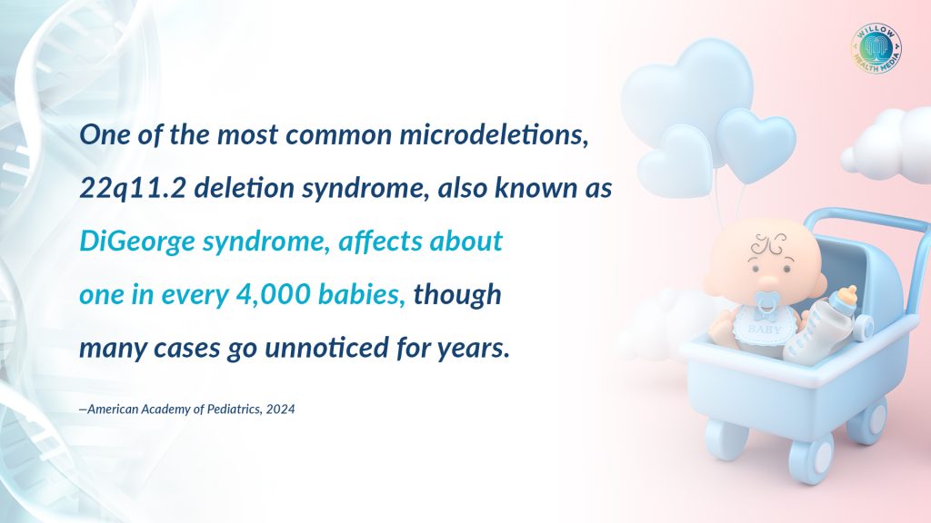 One of the most common microdeletions is called 22q11.2 deletion syndrome (or DiGeorge syndrome). It can cause heart and immune system problems, and it occurs in about 1 in every 3,000 to 4,000 births, according to MedlinePlus, U.S. National Library of Medicine – “Chromosome microdeletion”. This shows how a tiny, missing piece of genetic information can have a major impact on a person’s health.