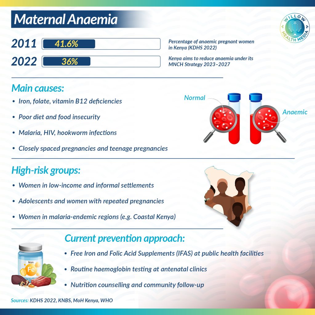Linda’s experience reflects a widespread and stubborn public health challenge. According to the 2022 Kenya Demographic and Health Survey (KDHS), about 41 per cent of pregnant women in Kenya are anaemic, a figure that has barely shifted in the past decade. The Ministry of Health (MoH) estimates that maternal anaemia contributes to at least one in every five maternal deaths in the country.
