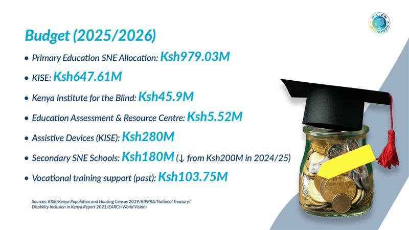 The 2025/2026 budget for Special Needs Education saw a slight increase to Ksh979.03 million for primary education, with significant portions allocated to key institutions. However, funding for special secondary schools was actually cut, from Ksh200 million to Ksh180 million.