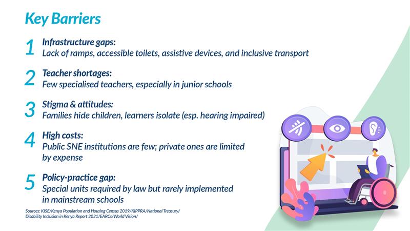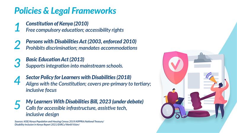 Kenya’s legal framework is strong. It is anchored by the Constitution (2010), which guarantees free basic education and accessible facilities; the Persons with Disabilities Act (2003), which prohibits discrimination; and the Sector Policy for Learners and Trainees with Disabilities (2018). The challenge, consistently highlighted by experts, is not a lack of laws but a failure in their implementation.