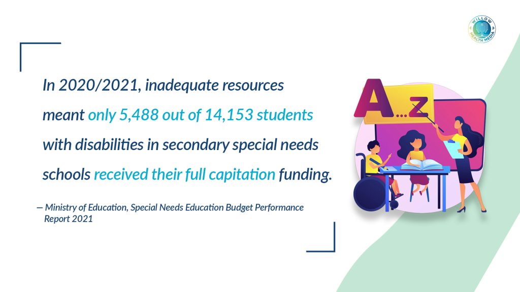 The financial commitment is also inconsistent. In the 2020/2021 academic year, inadequate resources meant only 5,488 out of 14,153 students with disabilities in secondary special needs education received their full capitation funding.